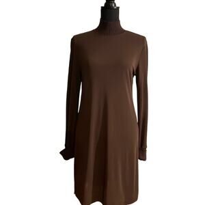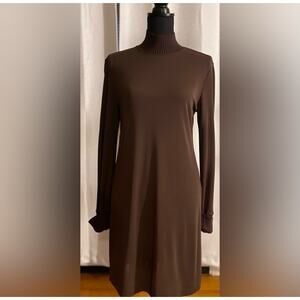 Beautiful chocolate brown turtleneck dress with ribbed cuffed sleeves and side slits.