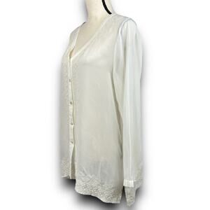 J Jill Cream Vneck Button Front Blouse Top Semi Sheer Embroidered Trim Medium