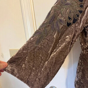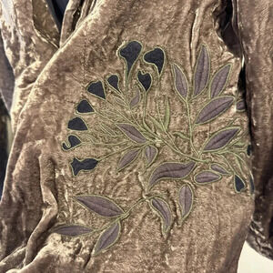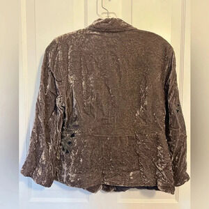 Beautiful blazer in brownish-gray crushed velvet with purple embroidery. In excellent condition with no flaws.