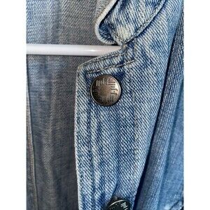 Beautiful J gill denim light wash jean jacket blue. Buttons metal have geometric patterns. Two pockets on the front