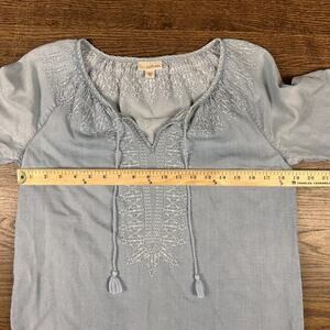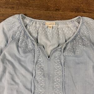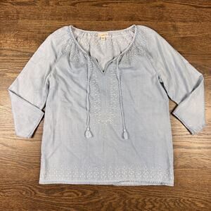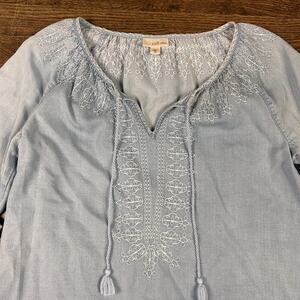 J Jill Denim Shirt Womens XS Light Blue Chambray Embroidered Boho Tassel Tunic