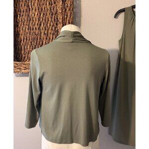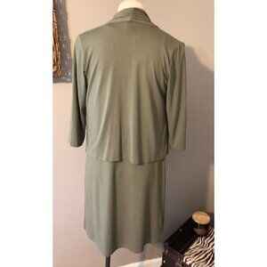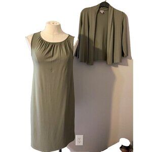 This pretty two piece set is from J. Jill in a petite size extra small. Solid olive green in color. Dress is a pullover style. 95% rayon and 5% lycra spandex. Machine washable.Jacket is mean to be worn open and has no fasteners.