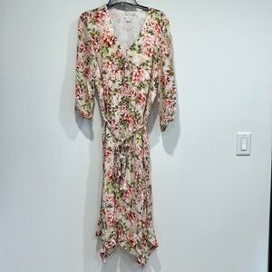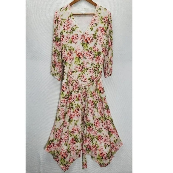 J Jill Dress Women Midi V- Neck 3/4 Sleeves Floral Elastic Waist Tie dress large