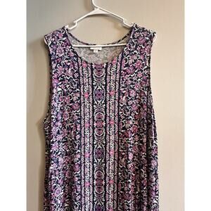 This J. Jill dress in women's size XL is a sleeveless maxi dress made from a stretchy knit jersey fabric. The dress features a floral pattern in multicolored threads, round neck, and a pullover closure. It is designed for various occasions such as travel, parties, or casual wear, making it a versatile and comfortable option for the spring, summer, or fall seasons. The dress is easy to care for as it is machine washable and offers a stretchy fit for added comfort. Perfect for those who love a relaxed and flowy style with a touch of bohemian flair.