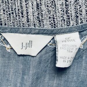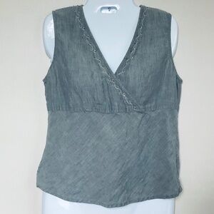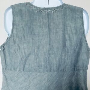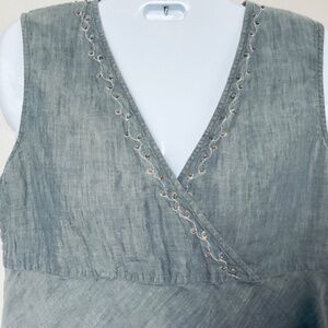 Equally perfect indoors and outdoors, this sleeveless denim-blue linen top from J. Jill refines with fresh texture. A playful yet sophisticated tank to add to your weekend edit, the crossed V-neck tank features delicate leaf embroidery accented by tiny tan beads at the neckline. One bead missing at the back of the neck (see photo). 100% Linen. Machine wash/dry.