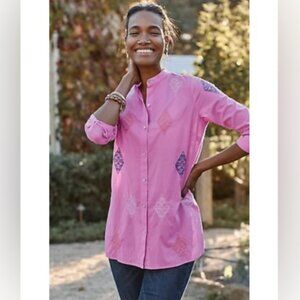J. Jill Embroidered Button-Front Cotton Tunic - Medium - Pink w/Blue/Tan/Silver
