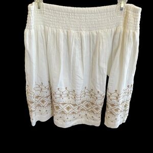 Short white skirt with tan embroidered with 2 slit pockets. Under skirt in white. Washable