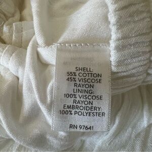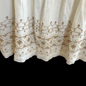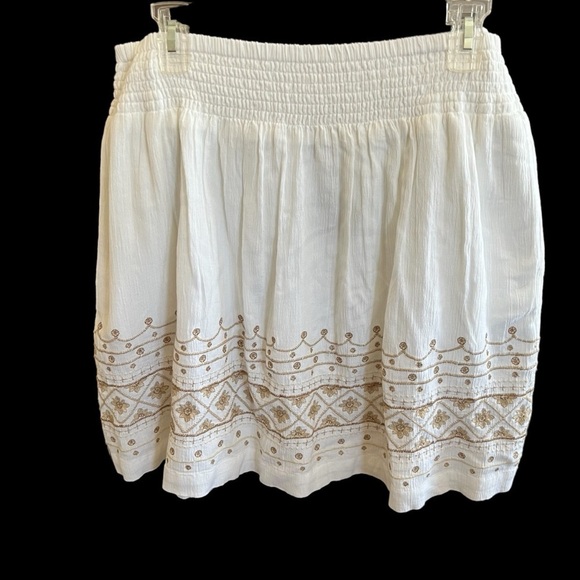 Short white skirt with tan embroidered with 2 slit pockets. Under skirt in white. Washable