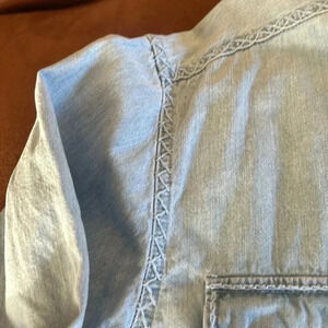 100% cotton has a denim look to it. Mid weight material. Embroidery throughout seems.