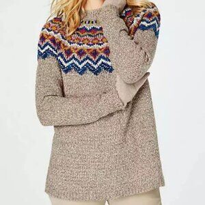 Beautiful JJill brown and tan knit sweater with multicolor fair isle pattern. Perfect with your favorite jeans and a fall vest. Great with boots or sneakers.