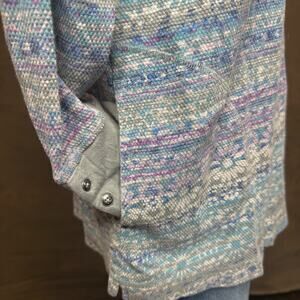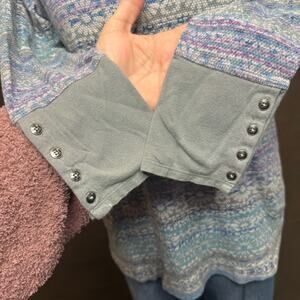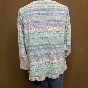 Soft, cozy, and beautifully patterned, this J. Jill Petite thermal top blends relaxed comfort with effortless style. Made from 100% cotton, it features a subtle Fair Isle-inspired print in muted tones of blue, lavender, and gray, finished with soft jersey cuffs accented by decorative buttons. A perfect everyday piece for cooler weather — think casual weekends, coffee runs, or cozy evenings in.