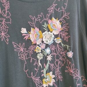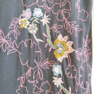 Multicolored embroidery. Cotton/Modal blend. 3/4 length sleeve. Multicolored stitch detail on sleeve. Round neckline.