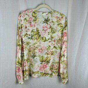 J Jill Floral Ruffle Trim Blouse Women Large Petite White Pink Green Cottagecore