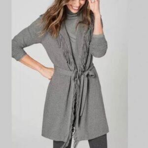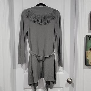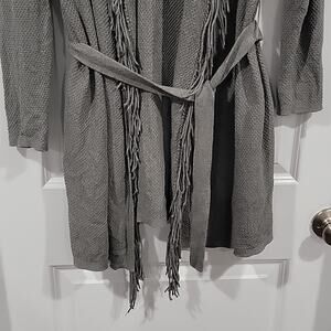 Long wrap cardi with oversize shawl collar and fringe. Ribbed cuffs and hemline. Dark gray heather.