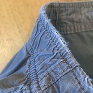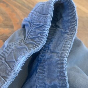 Pre-owned. There is wear at the partially elasticized waist where the elastic shows in spots. Comfortable pants, though. Darts at knees.