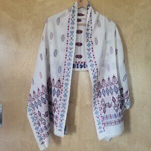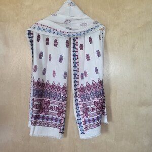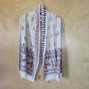 Lightweight cotton/rayon blend rectangular scarf with detailed embroidery: boho paisley geometrical pattern in multicolored pink, blue, tan & red threads against cream background.