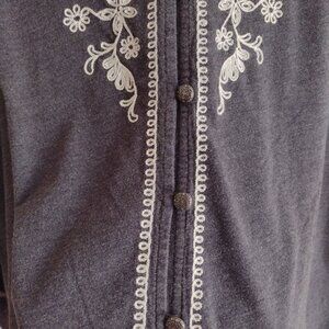 This cardigan offers an elegant touch with its intricate embroidery and soft, breathable fabric blend. In a charcoal heathered gray with ivory embroidery