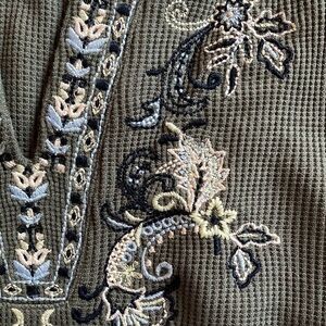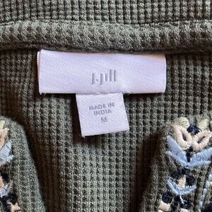 J Jill | Green Waffle Knit Tee Botanical Embroidery Long Sleeves M