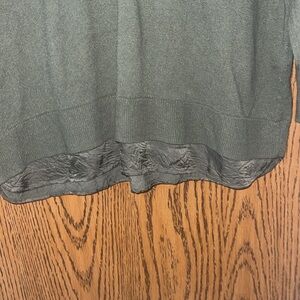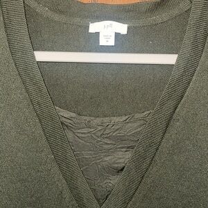 This is a dark green pullover vneck sweater that has two different fabric layers to allow for some dimension. It’s in excellent condition. Size women’s medium.