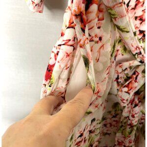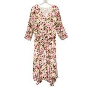 Tags: womens floral dress, v-neck dress, belted rayon dress, plus size clothing, J.Jill clothing, 2X women's dress, high-low hem dress, dress with pockets, 3/4 sleeve dress, pink and green dress, viscose lined dress, lightweight summer dress, botanical print dress, Handkerchief hem, Coquette, feminine, girly, special occasion