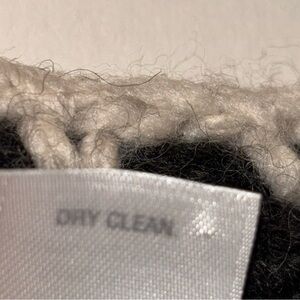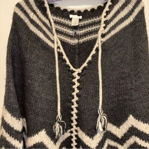 J. Jill Jacquard Poncho Cape, featuring a black and white geometric pattern. This poncho is made from a blend of 50% wool and 50% acrylic. It has a split neckline with tasseled ties and a relaxed, bohemian style. The poncho is one size