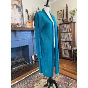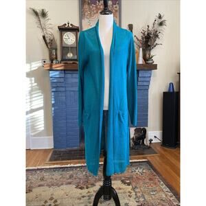 J. Jill LINEN L Tall Turquoise Blue Open Front Cardigan Sweater Pockets Knit