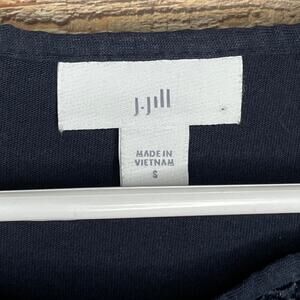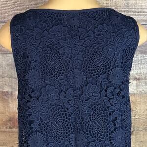 J. Jill Lace Overlay Dress. Size small. Navy blue lace over a lining with accordion pleated trim. Scalloped edge. Sleeveless. Excellent condition. Measurements are in the pictures.