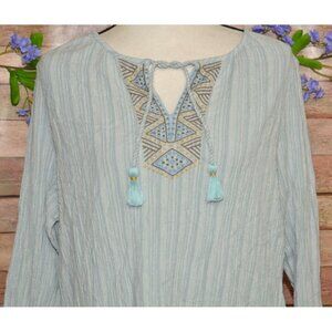 J. Jill Ladies Blue Striped Pullover Blouse XL Embroidered Tassels V-Neck Tunic