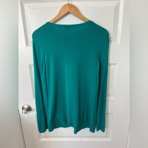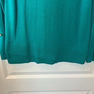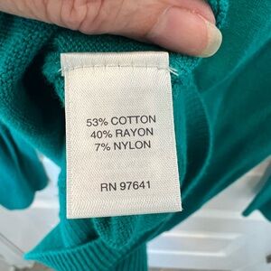 Beautiful teal jewel tone color on this comfortable, easy wearing sweater. Soft but durable cotton/rayon/nylon blend for easy wear and care. Very good, gently pressed-loved condition with no holes, stains, or odor. Smoke Free home.