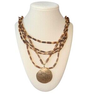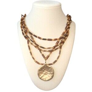 The J. Jill Gold Tone Pendant Cord Necklace features a round pendant with a slide closure and an adjustable cord. On the back of the pendant is a very small clear crystal. The brown faux wooden beads and gold tone hammered pendant add a touch of nature-inspired beauty to any outfit.