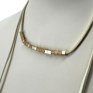 This stylish J Jill necklace features a modern and minimalist design. It is crafted with gold tone square cube beads strung along a soft, neutral-colored cord. The beads are arranged in sections, giving the necklace a unique geometric look.
