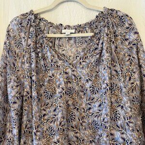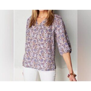 J Jill Linen Tunic Top Womens Medium Purple Floral Peasant Lace look Boho Blouse