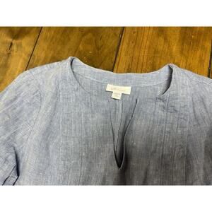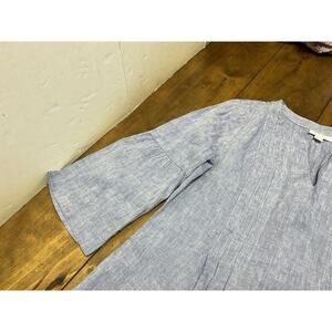 J Jill Love Linen Blue Chambray Notched Neck Bell Sleeve Pin Tucked Dress XSP