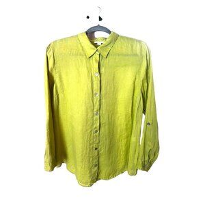 J Jill Love Linen Sz M Lime Green Button Up Tunic Blouse Lagenlook Roll Tab Sleeves Long Sleeves