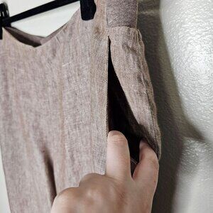 Brown linen tapered leg pants. Pull on with elastic waist. Front pockets.