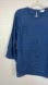 Linen popover top in deep blue features a button and loop closure in back with keyhole opening. Round neckline has eyelash fringe which is continued on the slits on each sleeve. The long sleeves are fitted to the elbow and then expand into a flared style to the wrists. There are five inch fringed slits on each sleeve. Side vents measure seven inches. High low hem.