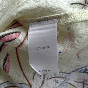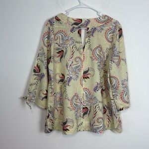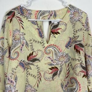J. Jill Love Linen Paisley Floral Midsummer Top. Size Medium. 100% linen. Top is a light yellow with paisley and floral print with pink, blues, white, and brown. V-neck with keyhole opening in the back. 3/4 length sleeves with grommets and ties. Top has an A-line shape with side slits at the hems. Armpit to pit measures 21 inches. Total length 26 inches. Comes from a smoke free home.