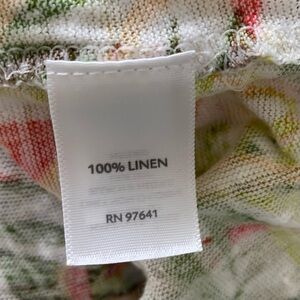 100% linen. Missing size tag, based on measurements fits like a large. Measured flat. Armpit to Armpit is 21.5”, shoulder to bottom hem is 26”. Good preowned condition. Free of rips, holes or stains.
