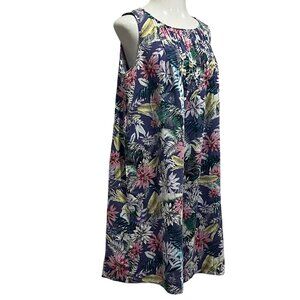 This loose-fitting linen dress features a tropical floral print, sleeveless, round neck, pintuck detail in bodice front and back, inseam side pockets, and a straight hem. Excellent condition, washable, purple with pink, yellow, green, white and blac floral. Size 1X