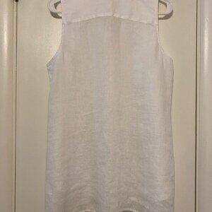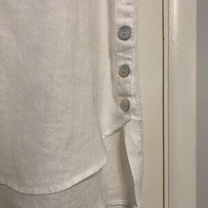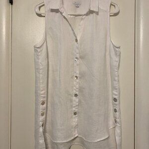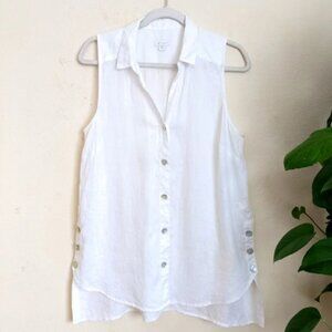 100% linen sleeveless collared shirt. Full button-down with buttons on the side as well. Slight high-low hem.