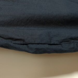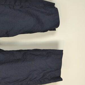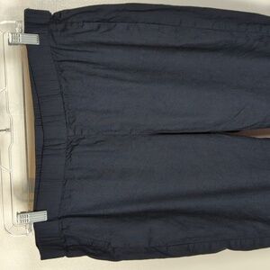 Navy blue. Elastic waistband, pull on style. Four pockets. There are a few small picks in the fabric (pictured), but no stains, holes, or fraying. Laid flat waist: 16.5in. Rise: 10.5in. Inseam: 25.5in.