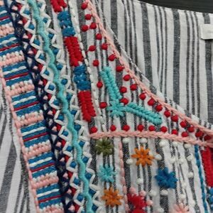 The J. Jill Love Linen Sz. 3X 100% Linen Embroidered Jacket is a stylish and versatile outerwear piece. Made from lightweight and unlined linen, this mid-length jacket features a relaxed fit with a hook and eye closure for easy wear. The embroidered striped pattern adds a touch of bohemian and classic style, making it a trendy addition to any wardrobe. Handmade in India, this jacket is machine washable and comes in a stunning multicolor palette.