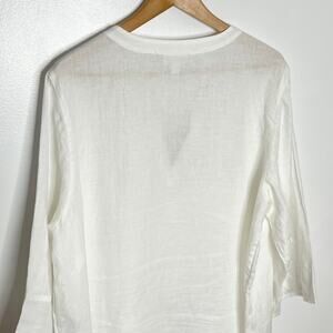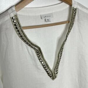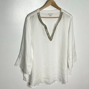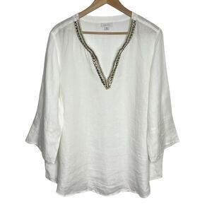 J. Jill Love Linen Womens Pullover Blouse 2X White Embellished V Neck Coastal