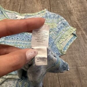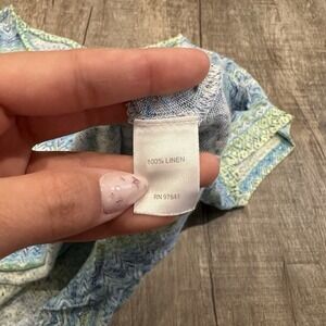 J Jill Love Linen Womens Short Sleeve Tee Geometric Print 100% Linen Sz M Flowy. great used condition. dies have a small hole in the front. lightweight linen. has side slits. 100% linen