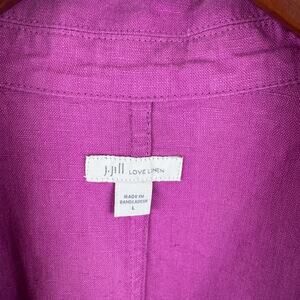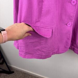 100% linen, magenta color, v-neck, button closure, front flap pockets, unlined, size large.