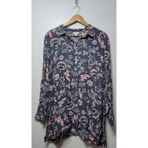 J. Jill Marvelflor Black Floral Print Button Up Side Slit Tunic Top L Petite