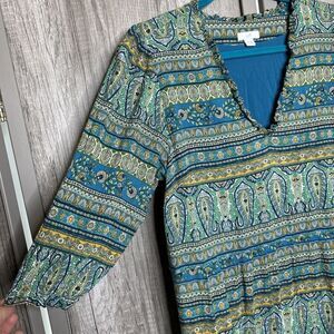 J Jill Midi Dress A Line Lined Blue and Green Short Sleeve Resort Size Medium