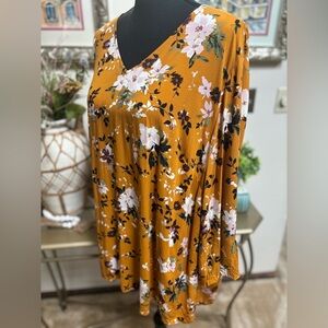 J. Jill Mustard and Peach Floral Blouse V-Neck Flare Sleeve Relaxed Tunic SZ XL