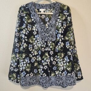 Brand new without tags! J. Jill Floral and Lace detailing Blouse with a flowy relaxed fit in Size Medium. Measurements are 21.5" bust and 26.5 length. Mother of Pearl buttons down the front and also on the sleeve cuffs. Cottage core style or Coastal Grandma look. Elevated Blouse for a flattering fit and easy wear!