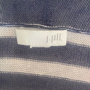 This navy blue and white striped long sleeve kimono cardigan is by J. Jill. The lightweight knit open front cardigan is made of a linen viscose rayon blend. The size tag is missing, but based on measurements I believe it would best fit a plus size 1X. Great condition! It would be great paired over a Cami and would double as a swimsuit cover-up on a cool beach evening.